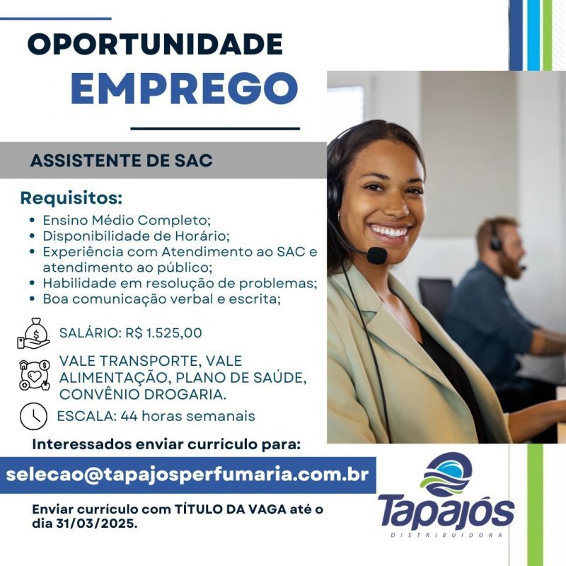 Distribuidora Tapajós seleciona Assistente de sac; Envie seu currículo!