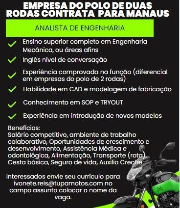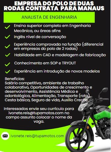 Empresa do polo de duas rodas contrata Analista de Engenharia; Envie seu currículo!