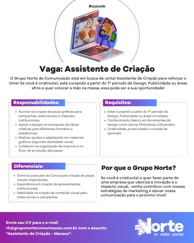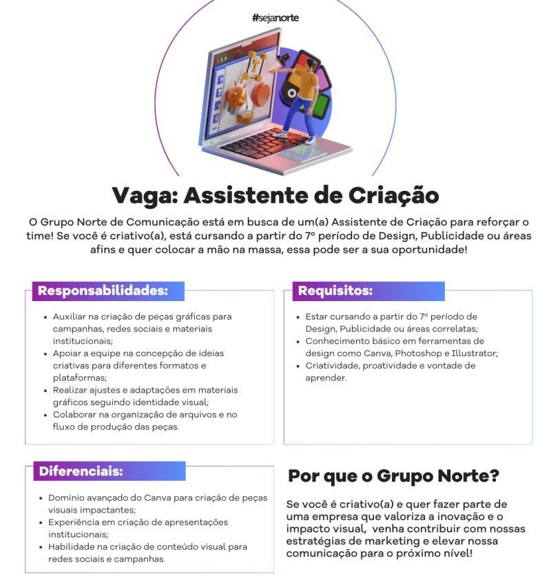 Empresa está selecionando Assistente de criação; Envie seu currículo!