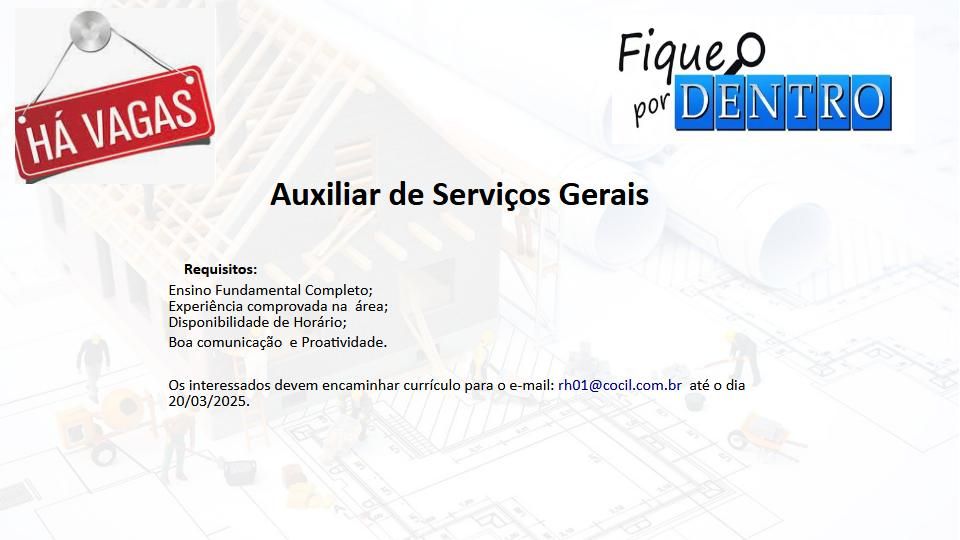 Empresa está selecionando Auxiliar de serviços gerais; Envie seu currículo!