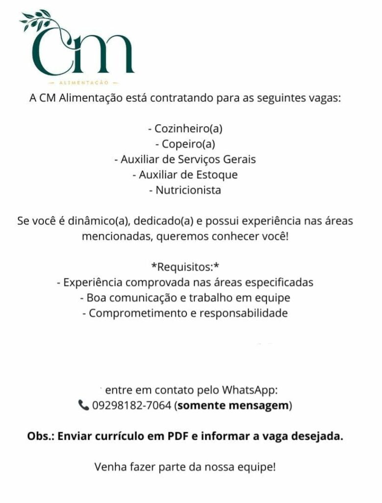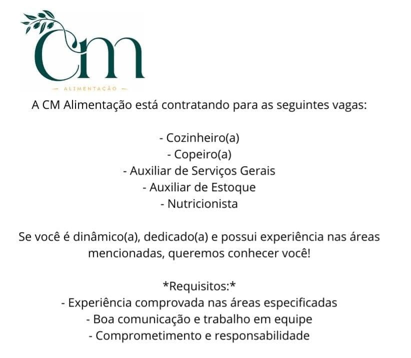 Empresa está selecionando Cozinheiro (a), Copeiro (a), Auxiliar de serviços gerais, Auxiliar de estoque, Nutricionista; Envie seu currículo!
