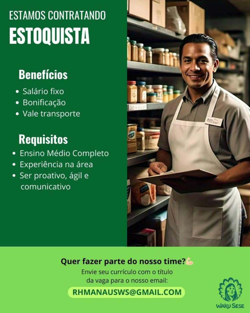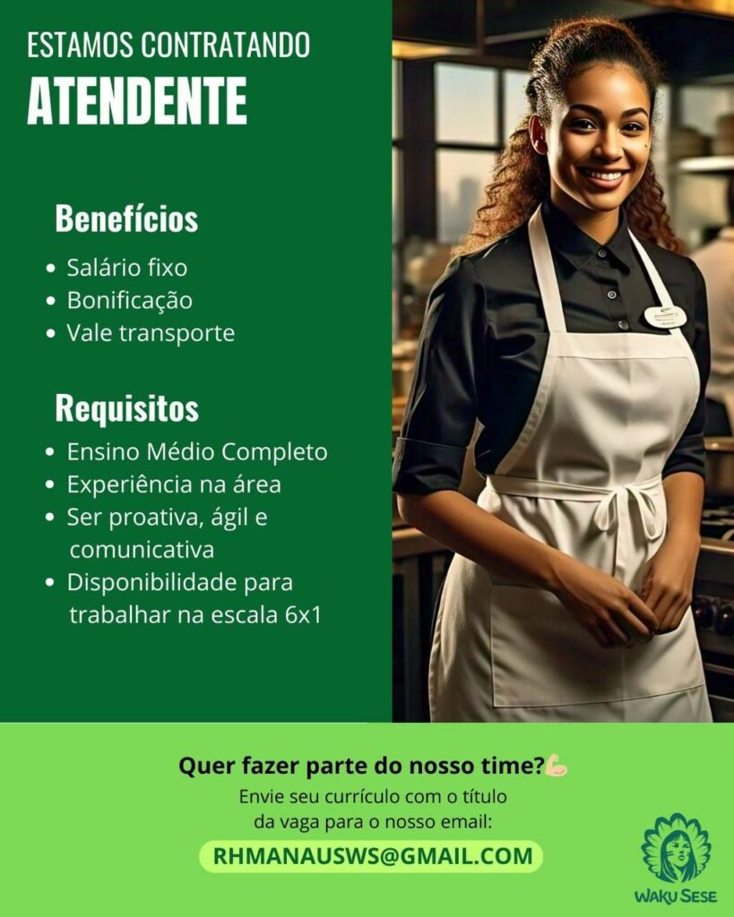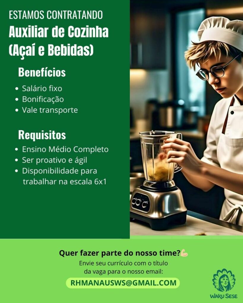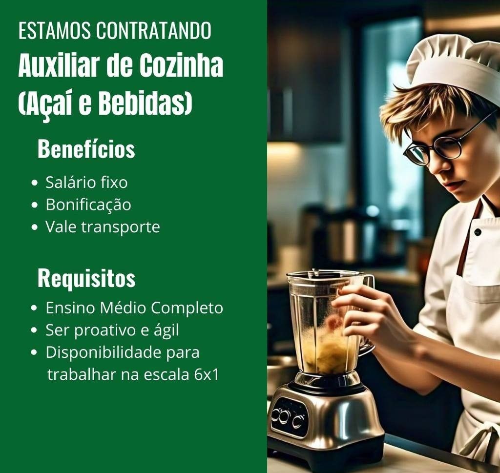 Empresa está selecionando Estoquista, Atendente, Auxiliar de cozinha (açaí, bebidas); Envie seu currículo!