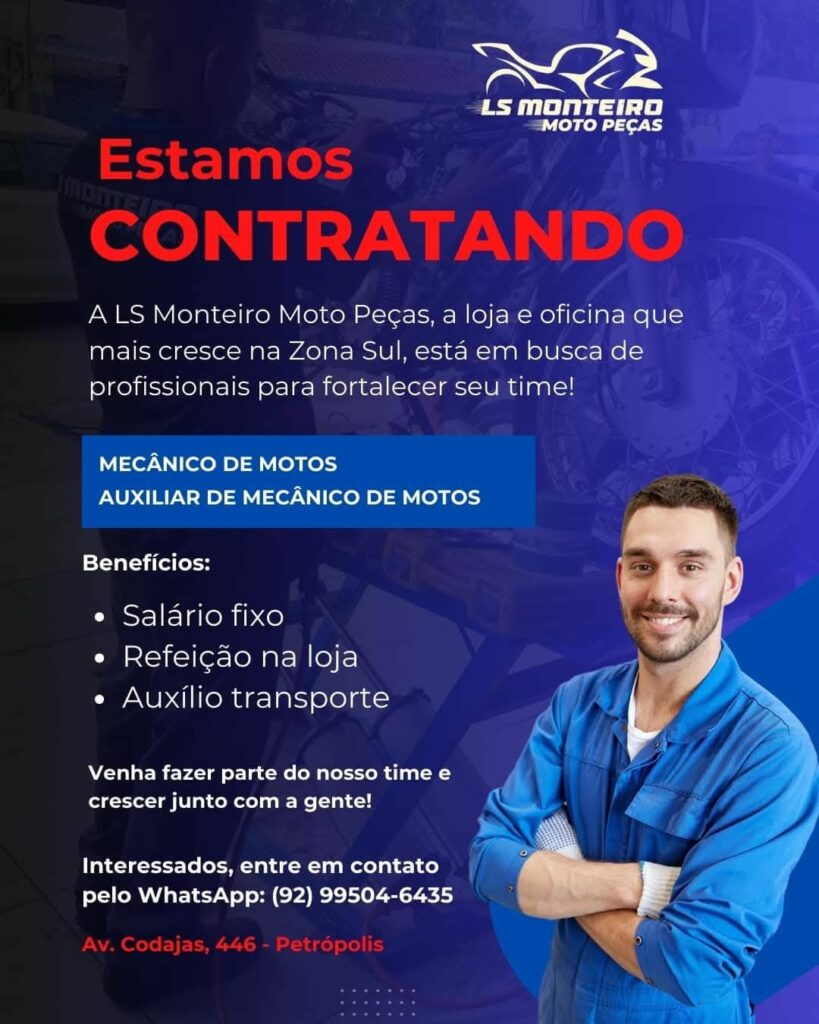 Empresa está selecionando Mecânico de motos, Auxiliar de mecânico de motos; Envie seu currículo!