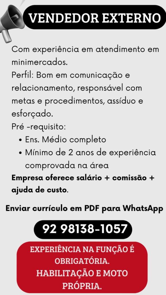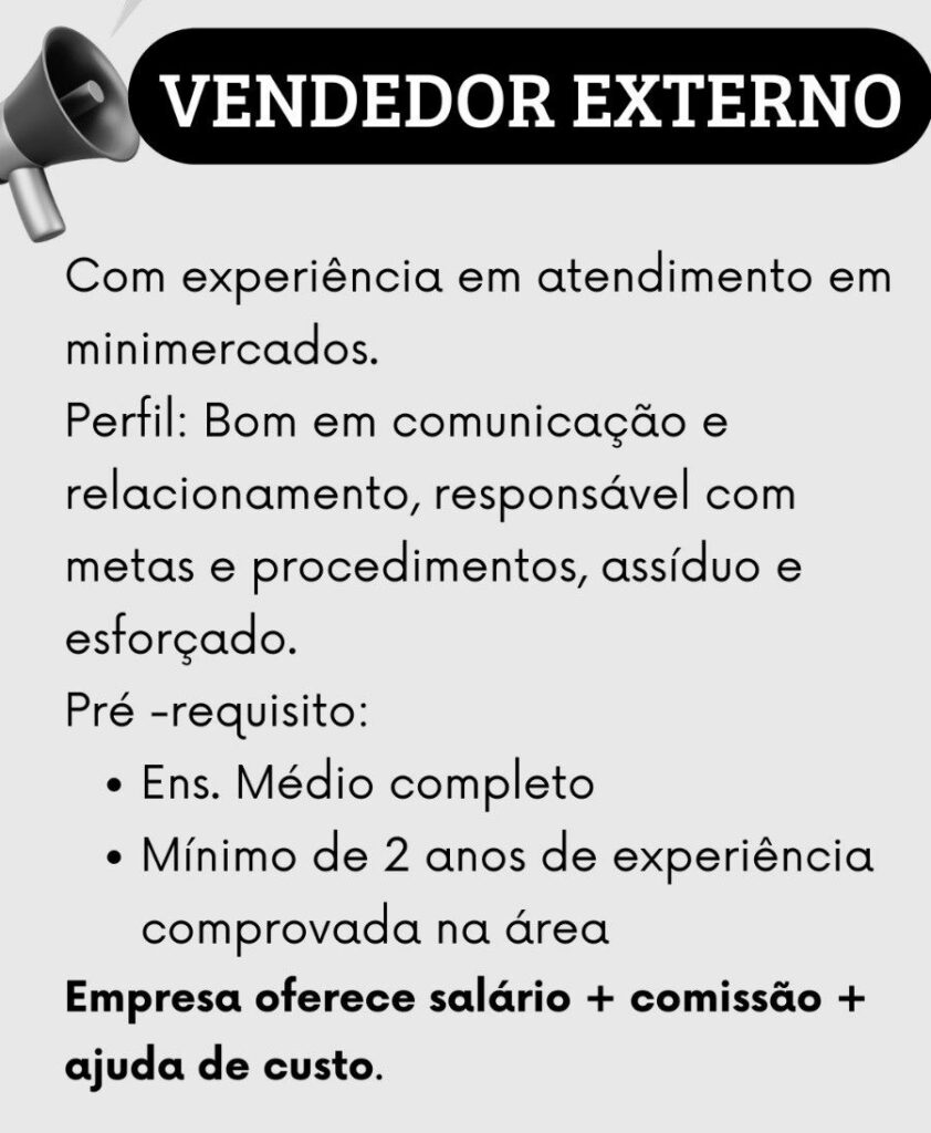 Empresa está selecionando Vendedor externo; Envie seu currículo!