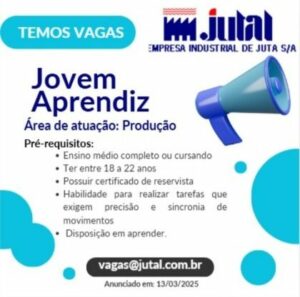 Empresa Jutal seleciona Auxiliar de produção, Aprendiz; Envie seu currículo!