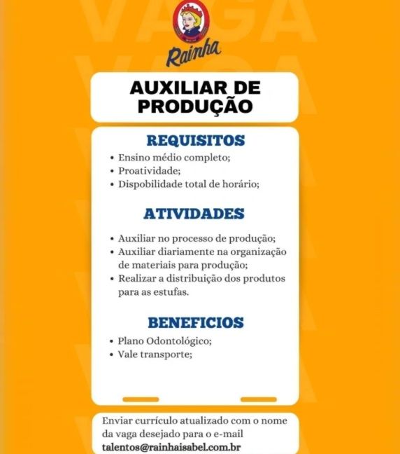 Empresa Rainha Isabel seleciona para início imediato Auxiliar de Produção; Envie seu currículo!