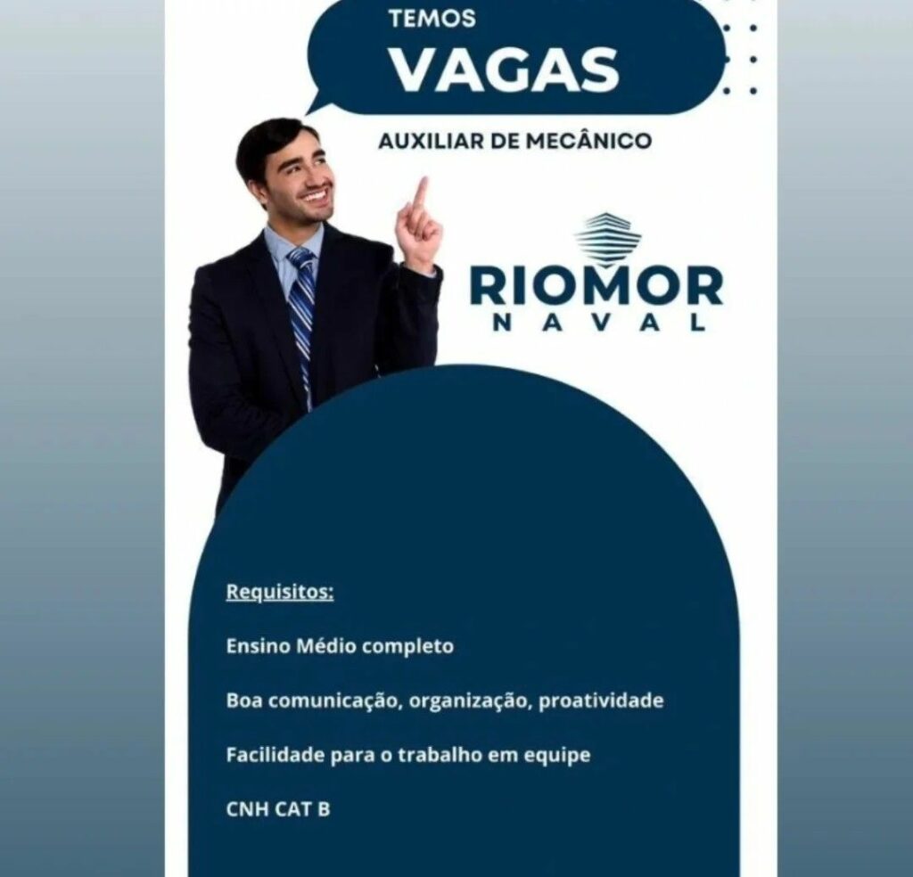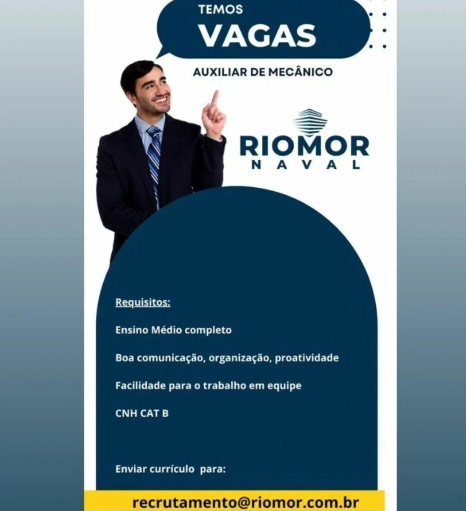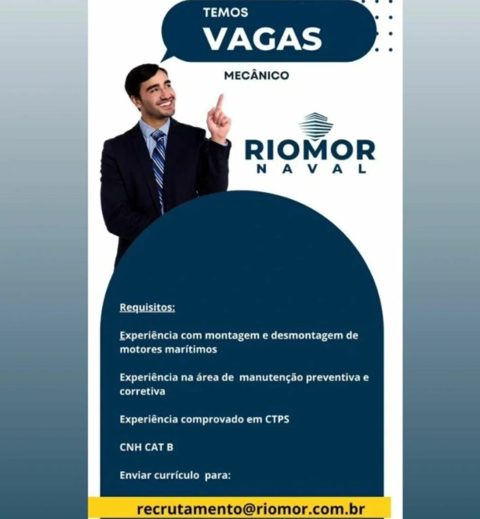 Empresa Riomor naval seleciona Mecânico, Auxiliar de mecânico; Envie seu currículo!