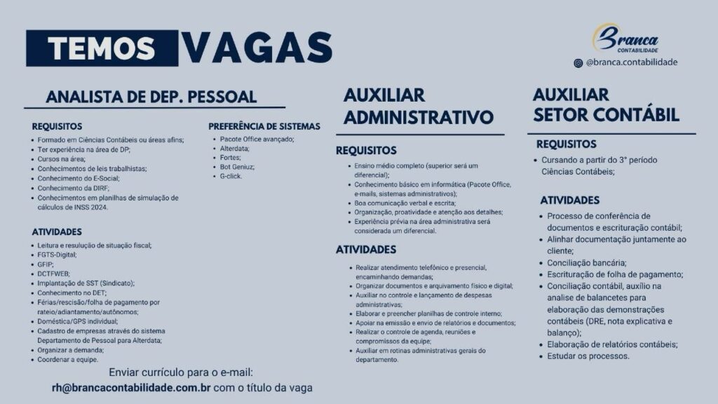 Empresa seleciona Analista de departamento pessoal, Auxiliar administrativo, Auxiliar de setor contábil; Envie seu currículo!