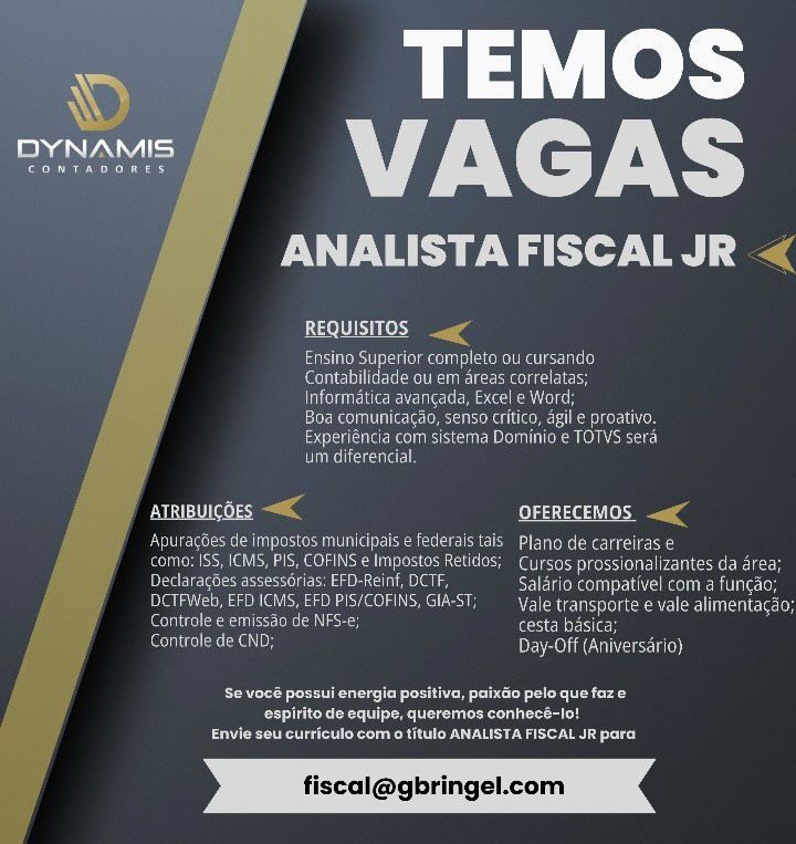 Empresa seleciona Analista fiscal Jr; Envie seu currículo!