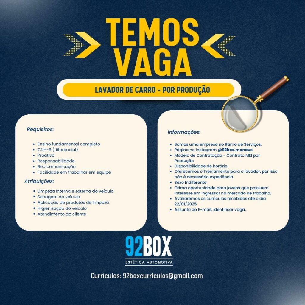 Empresa seleciona Lavador de carro por produção; Envie seu currículo!