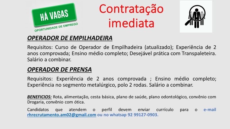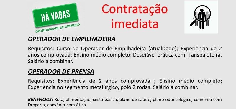 Empresa seleciona para contratação imediata Operador de empilhadeira, Operador de prensa; Envie seu currículo!