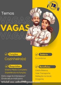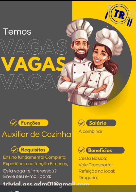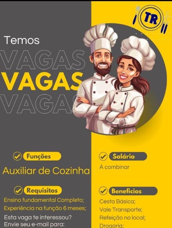 Empresa seleciona para seguintes vagas Auxiliar de cozinha, Cozinheiro (a); Envie seu currículo!