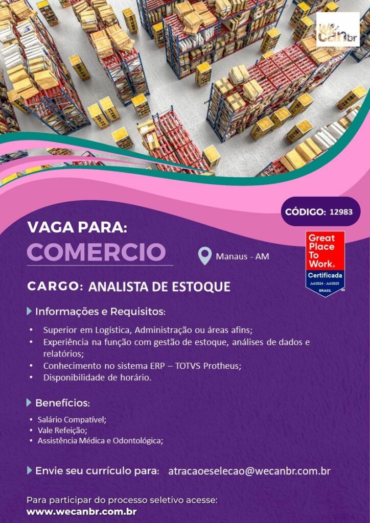 Empresa seleciona para vaga de Analista de estoque; Envie seu currículo!