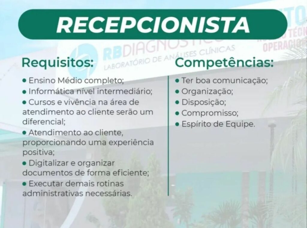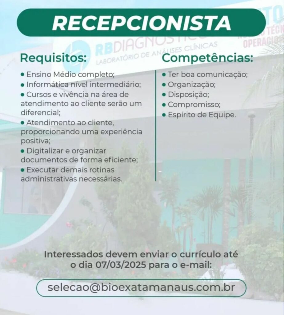 Empresa seleciona para vaga de Recepcionista; Envie seu currículo!