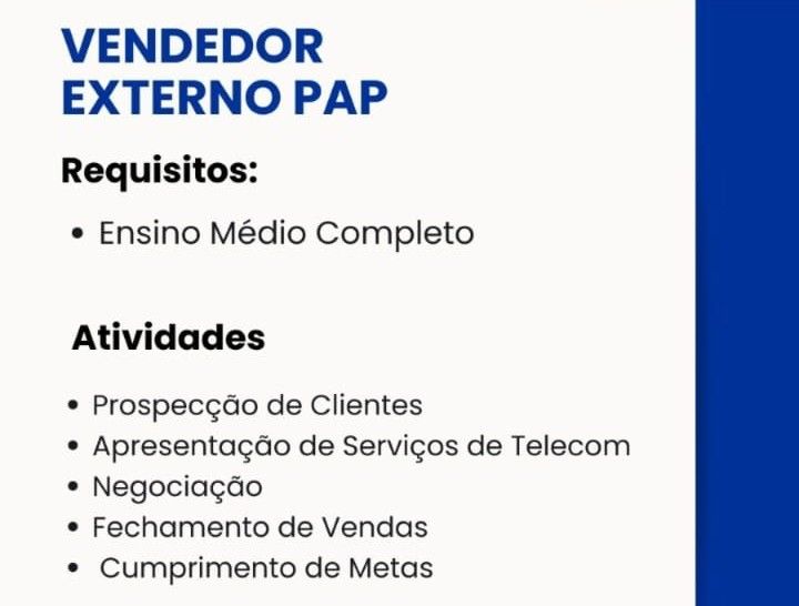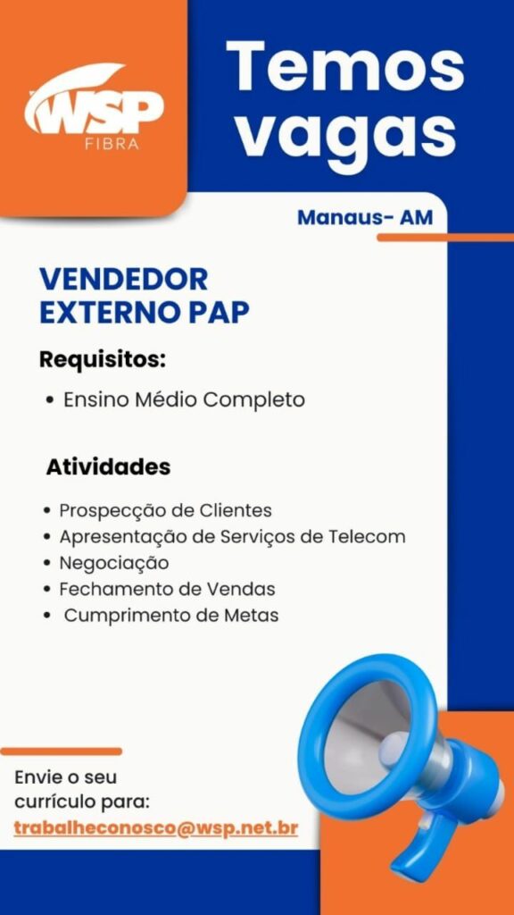 Empresa seleciona Vendedor externo pap; Envie seu currículo!