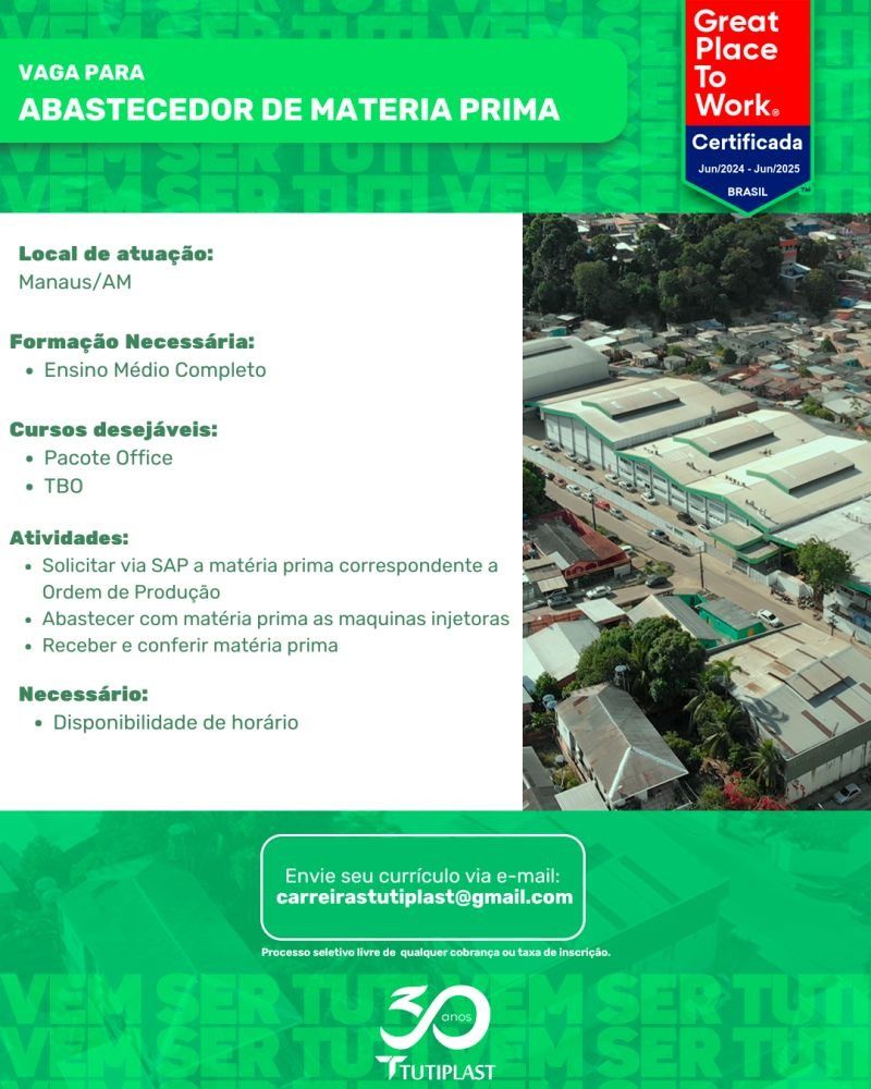 Fábrica da Tutiplast seleciona para novas vagas de emprego em Manaus