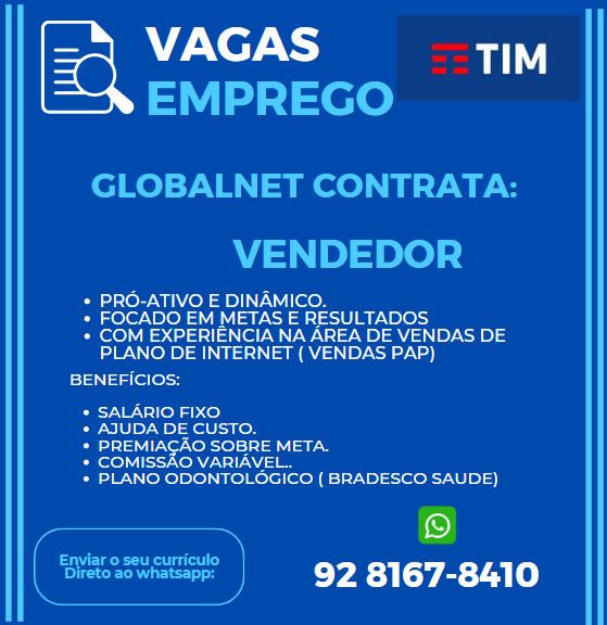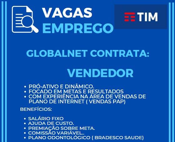Globalnet seleciona Vendedor; Envie seu currículo!