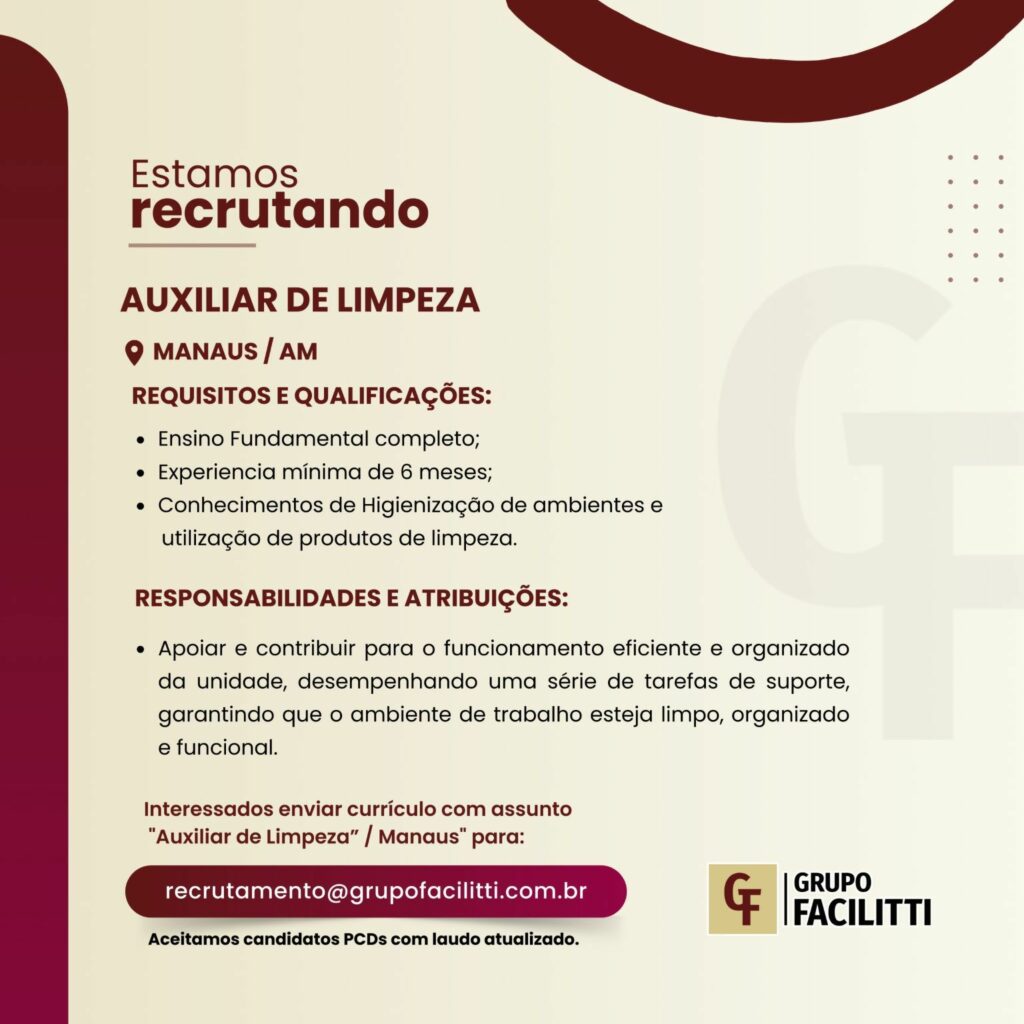 Grupo Facilitti seleciona Auxiliar de limpeza; Envie seu currículo!