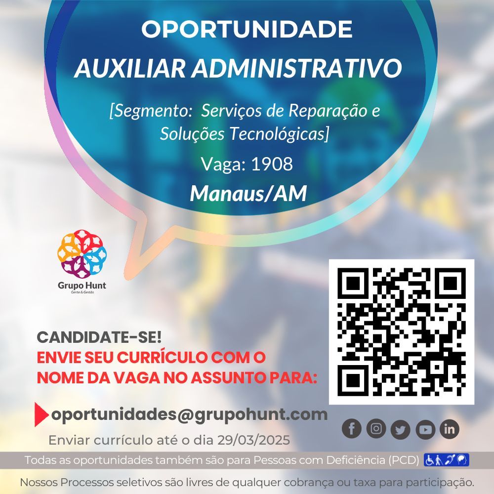 Grupo Hunt seleciona Auxiliar administrativo; Envie seu currículo!