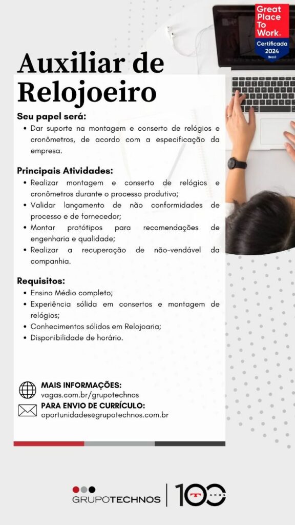 Grupo technos está selecionando Montador relógios, Auxiliar de qualidade, Auxiliar de logística, Auxiliar de relojoeiro; Envie seu currículo!