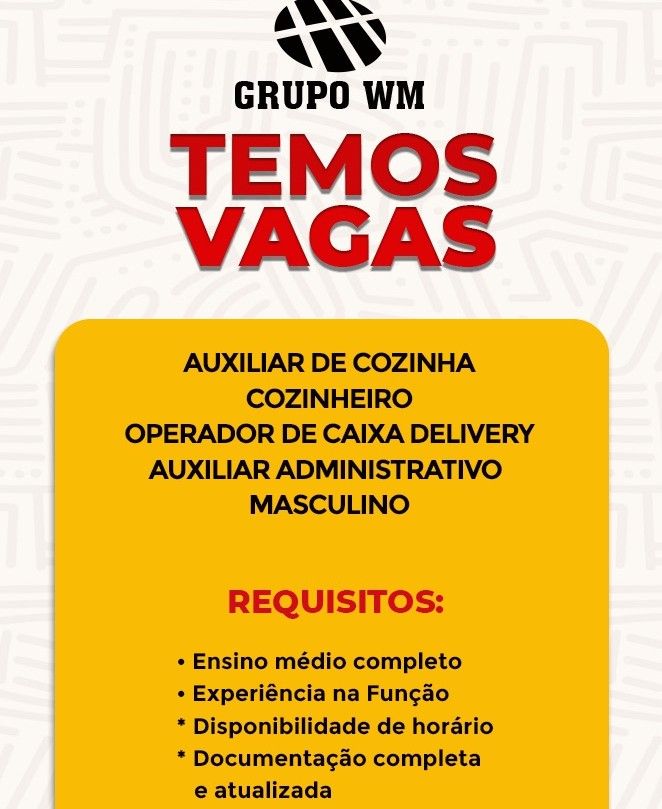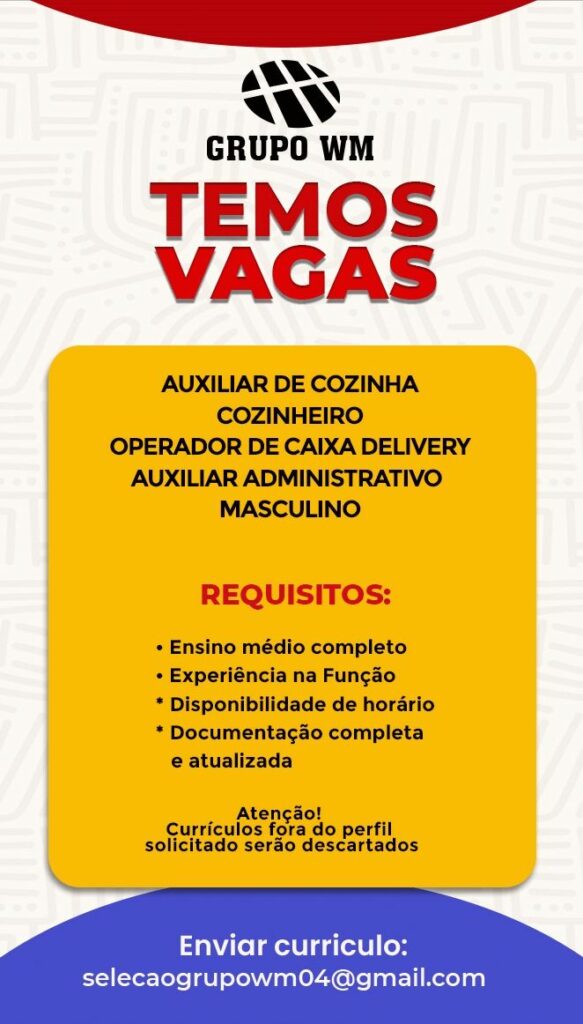 Grupo WM seleciona Auxiliar de cozinha, Cozinheiro, Operador de caixa delivery, Auxiliar administrativo; Envie seu currículo!