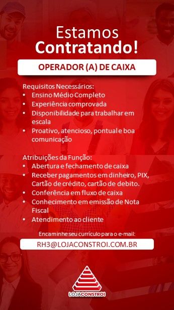 Loja Constrói seleciona Operador (a) de caixa; Envie seu currículo!