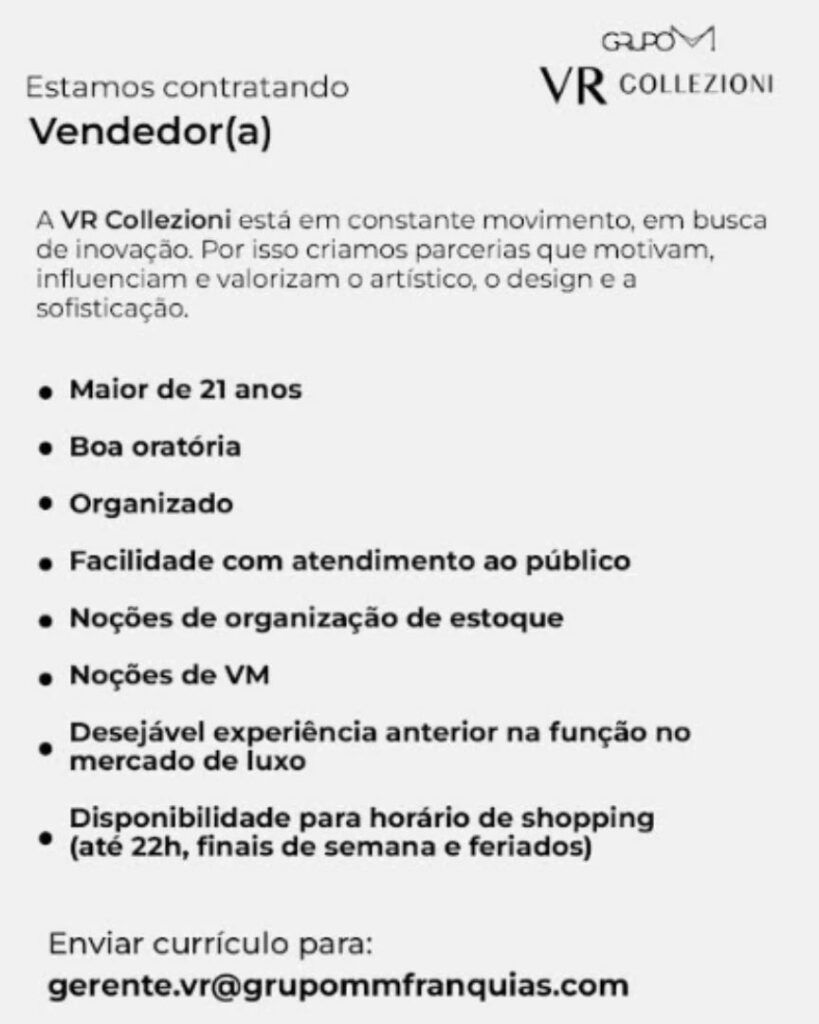 Lojas Collezione seleciona Vendedor (a); Envie seu currículo!