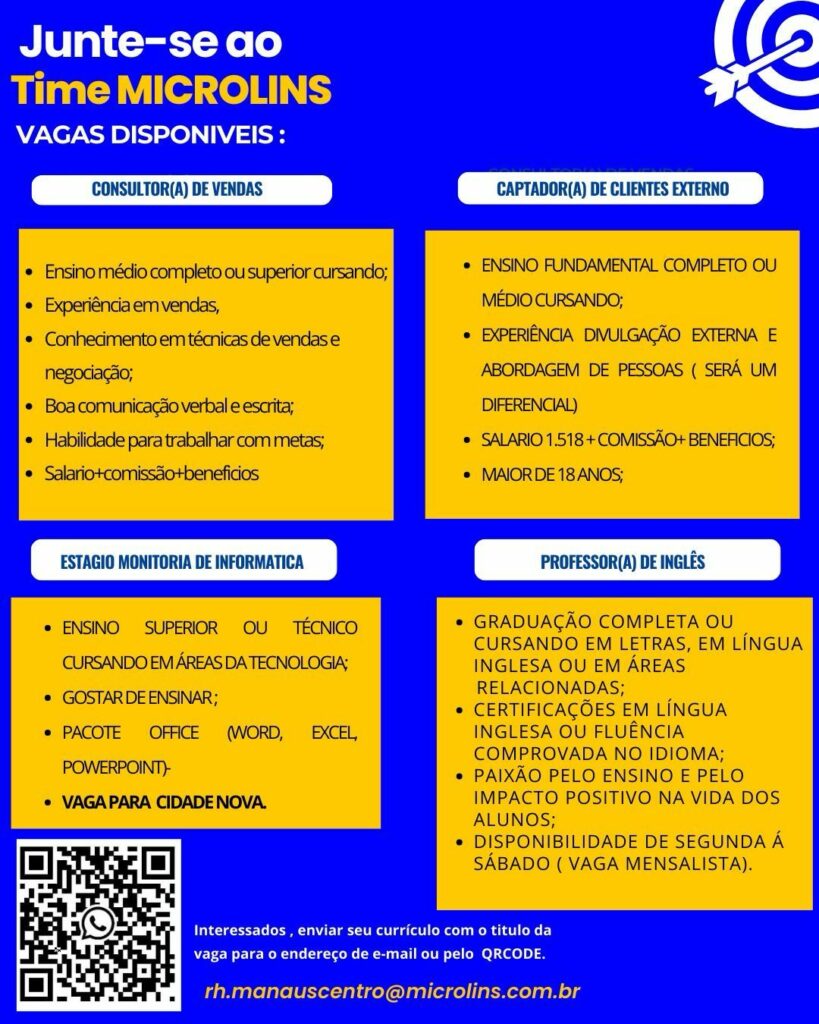 Microlins seleciona Consultor (a) de vendas, Captador (a) de clientes externos, Estágio Monitora de informática, Professor (a) de inglês; Envie seu currículo!