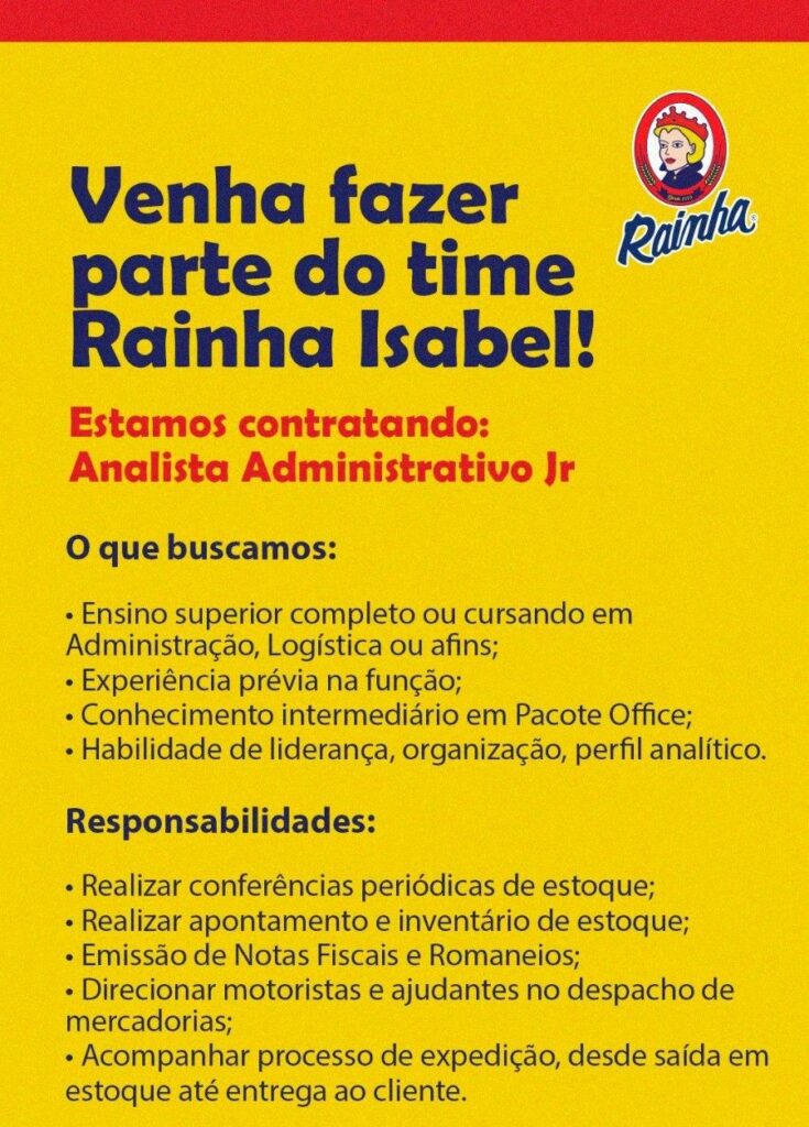 Rainha está selecionando Analista administrativo jr; Envie seu currículo!