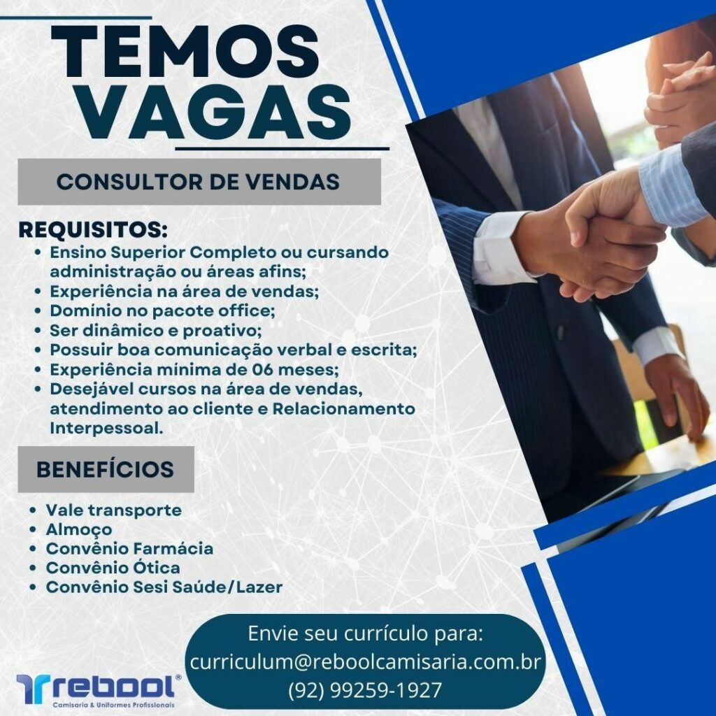 Rebool camisaria seleciona Consultor de vendas; Envie seu currículo!