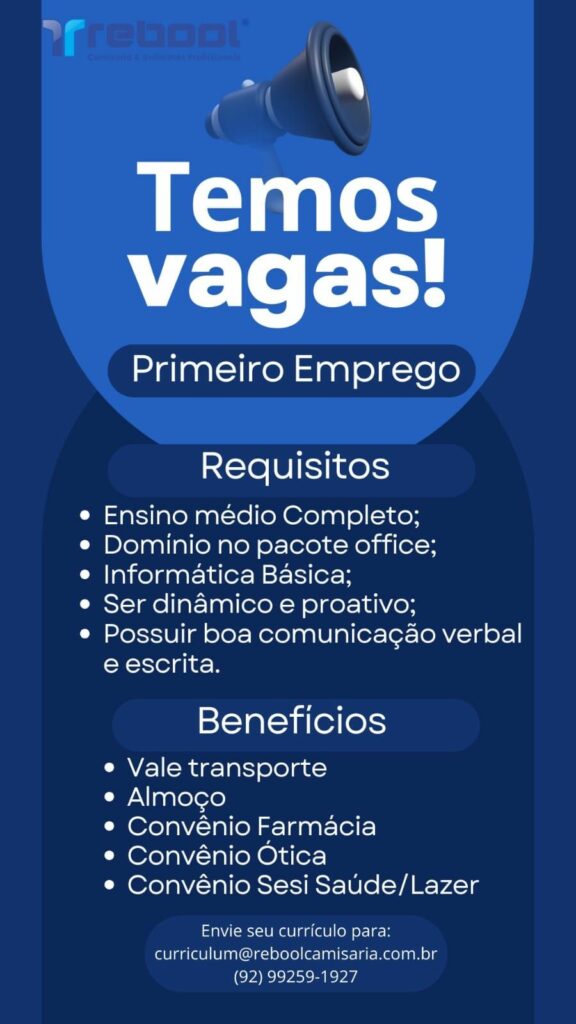Rebool camisaria seleciona para Primeiro Emprego; Envie seu currículo!
