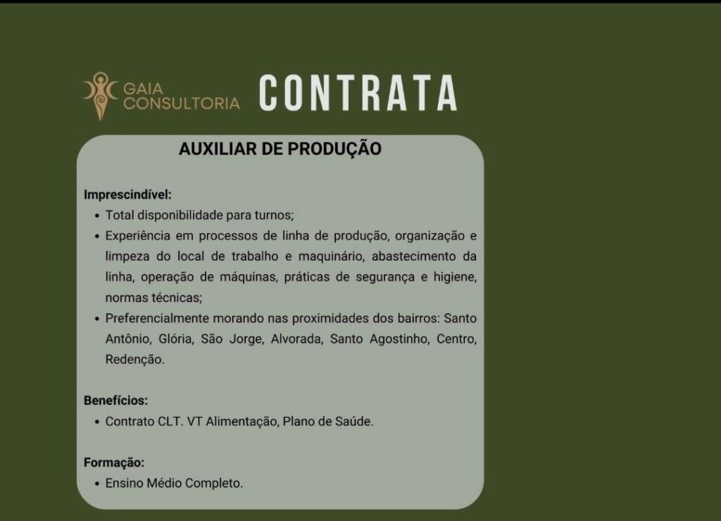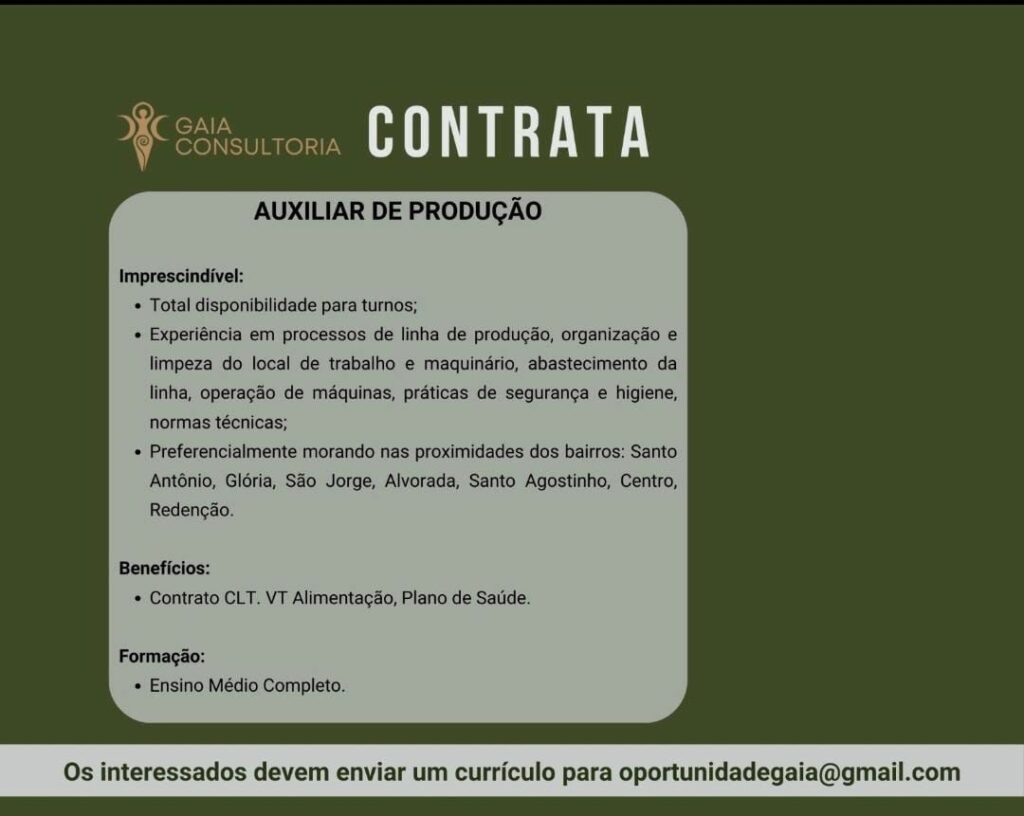 Rh abre seleção para vaga de Auxiliar de produção; Envie seu currículo!