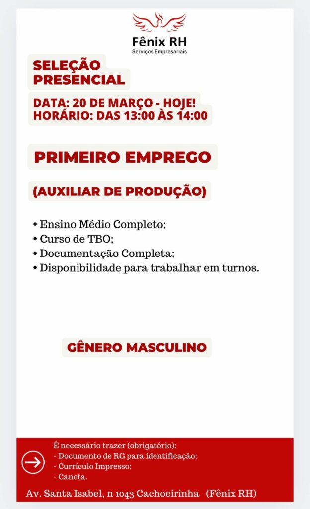 Rh abre seleção para vaga de Auxiliar de produção Primeiro emprego; Envie seu currículo!