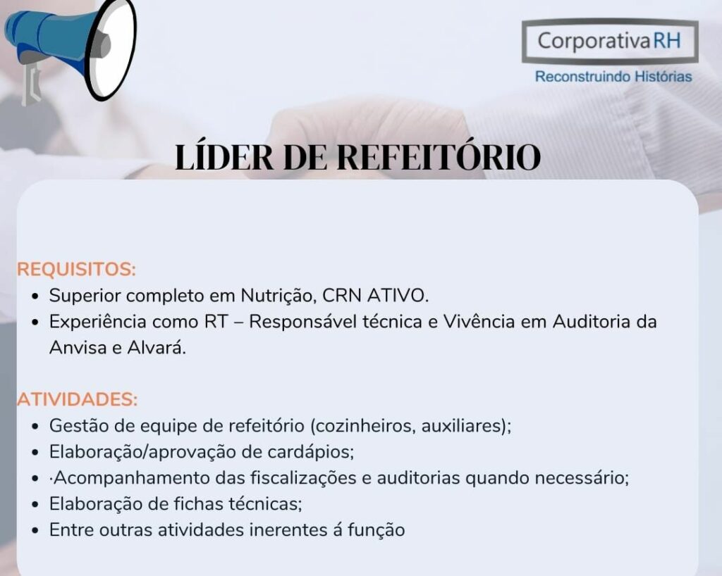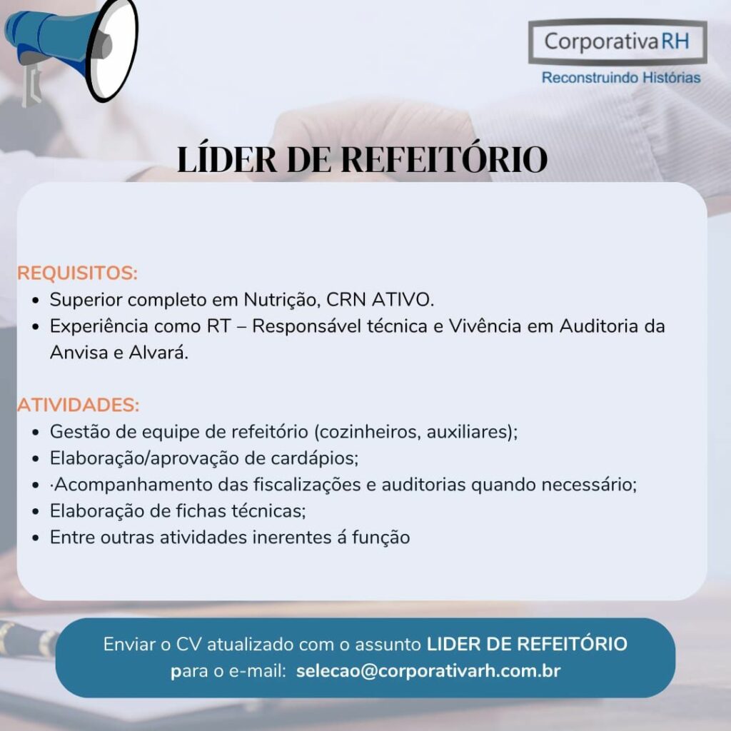 Rh está selecionando Líder de refeitório; Envie seu currículo!