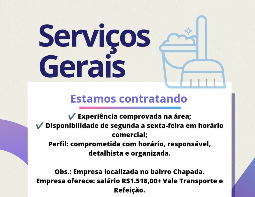 Rh está selecionando Auxiliar de serviços gerais; Envie seu currículo!