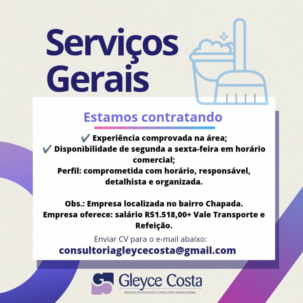 Rh está selecionando Serviços Gerais; Envie seu currículo!