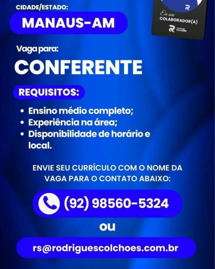 Rodrigues colchões seleciona Conferente; Envie seu currículo!