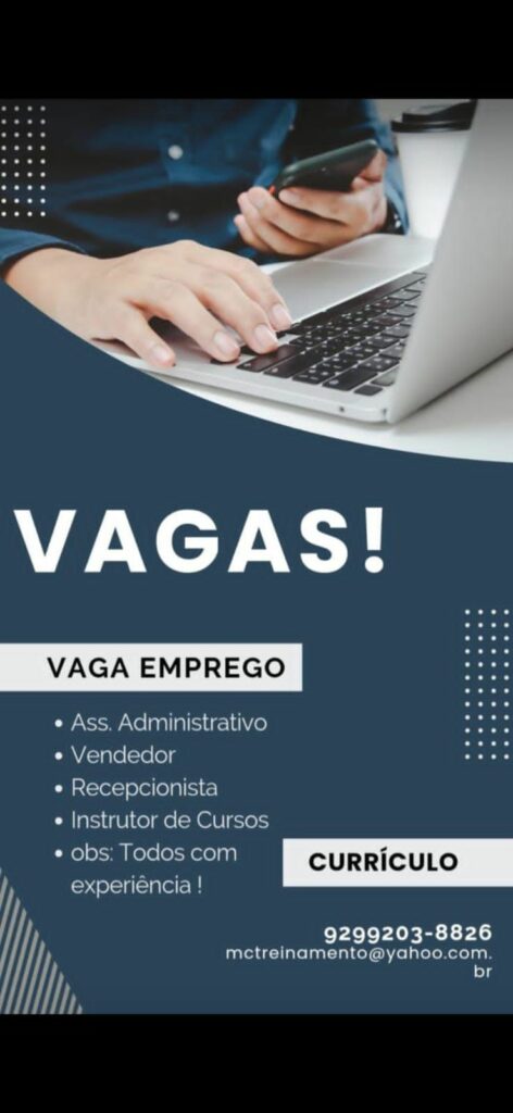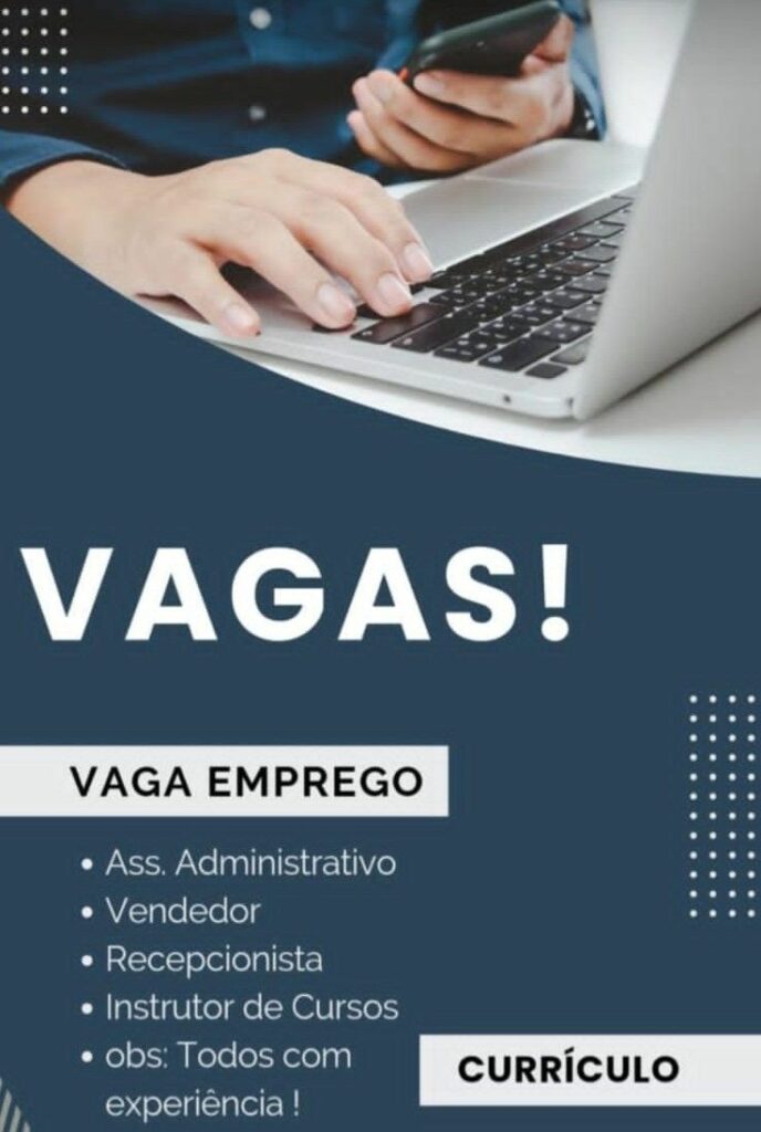 Seleção para seguintes vagas Assistente administrativo, Vendedor, Recepcionista, Instrutor de cursos; Envie seu currículo