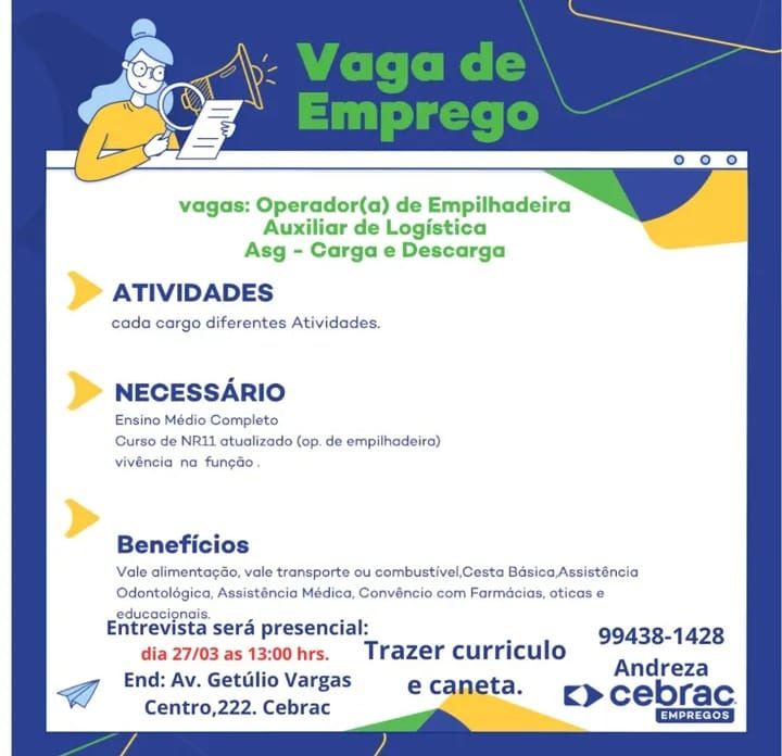 Seleção para Seguintes vagas Operador (a) de Empilhadeira, Auxiliar de logística, ASG – carga e descarga; Envie seu currículo!