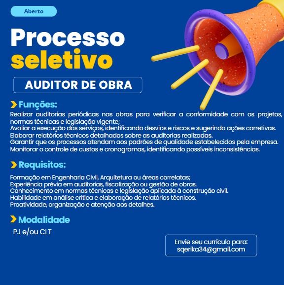 Seleção para vaga de Auditor de obra; Envie seu currículo!