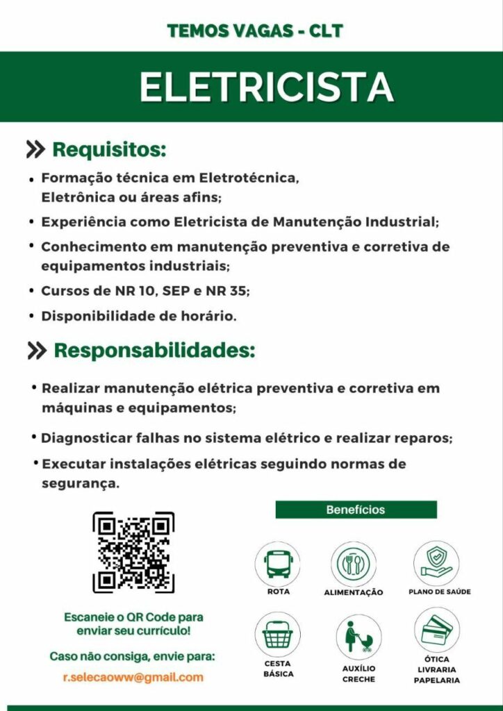 Seleção para vaga de Eletricista; Envie seu currículo!
