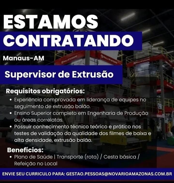 Seleção para vaga de Supervisor de extrusão; Envie seu currículo!