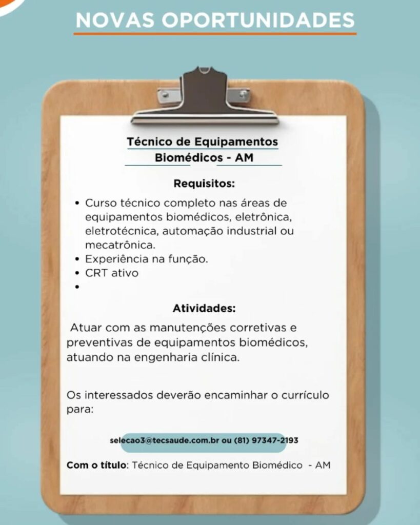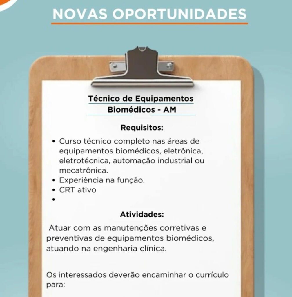 Seleção para vaga de Técnico de equipamentos biomédico; Envie seu currículo!