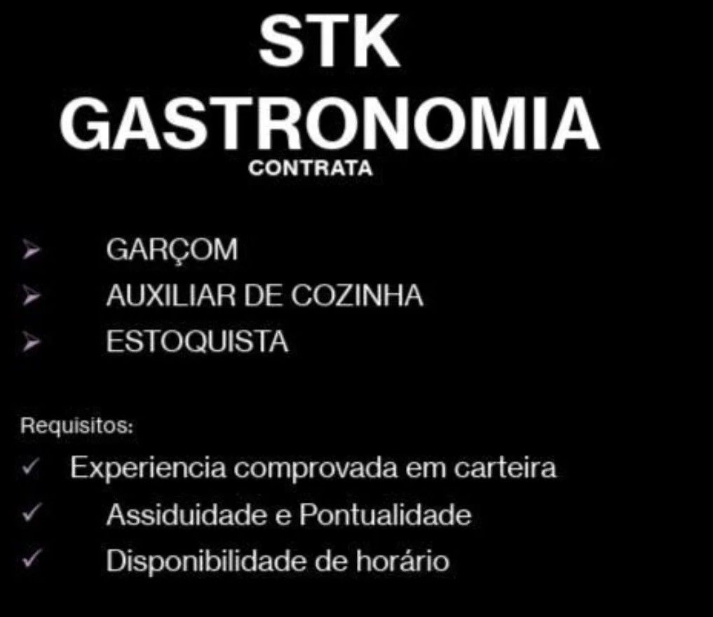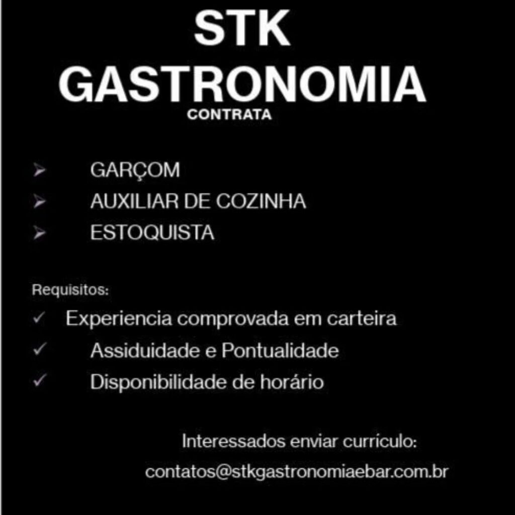 STK gastronomia seleciona Garçom, Auxiliar de cozinha, Estoquista; Envie seu currículo!