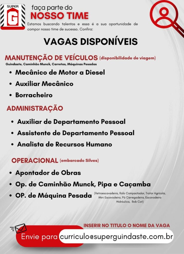 Super guindaste seleciona Mecânico de motor a diesel, Auxiliar mecânico, Borracheiro, Auxiliar de departamento pessoal, Assistente de departamento pessoal, Analista de Recursos Humanos, Apontador de obras, Op. de caminhão munck, pipa e caçamba, Op. de máquina pesada; Envie seu currículo!
