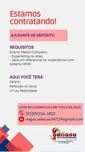 Adriana distribuidora seleciona Ajudante de depósito; Envie seu currículo!