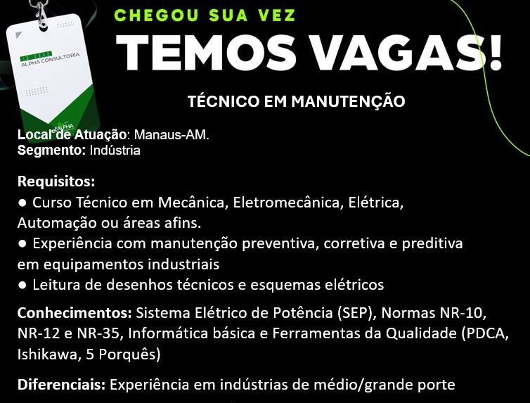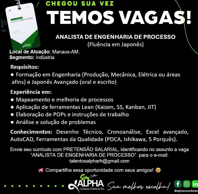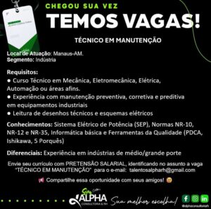 Alpha consultoria seleciona Analista de Engenharia de Processo, Técnico em Manuntenção; Envie seu currículo!