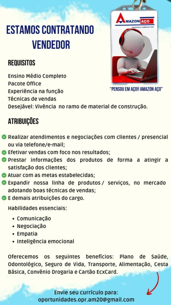 Amazon Aço recrutando para três vagas de emprego em Manaus