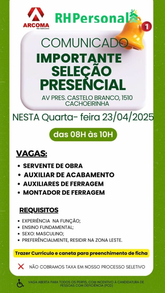 Arcoma seleciona Servente de obra, Auxiliar de Acabamento, Auxiliares de acabamento, Auxiliares de ferragem, Montador de Ferragem; Envie seu currículo!