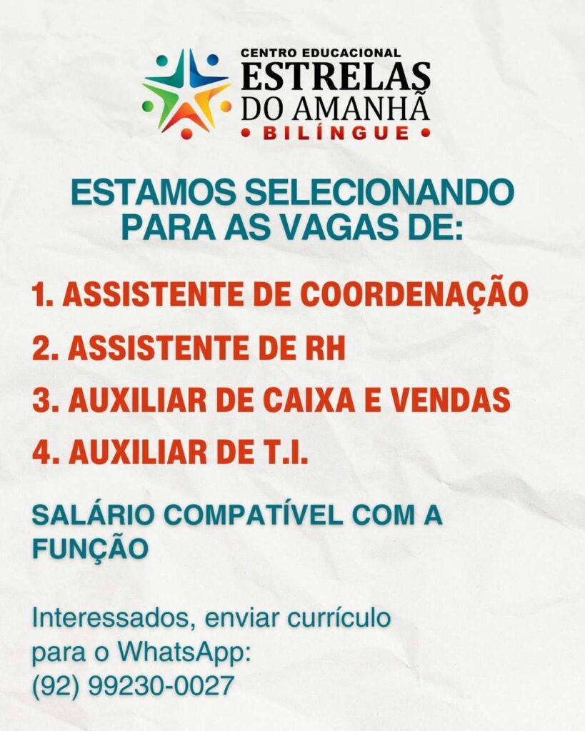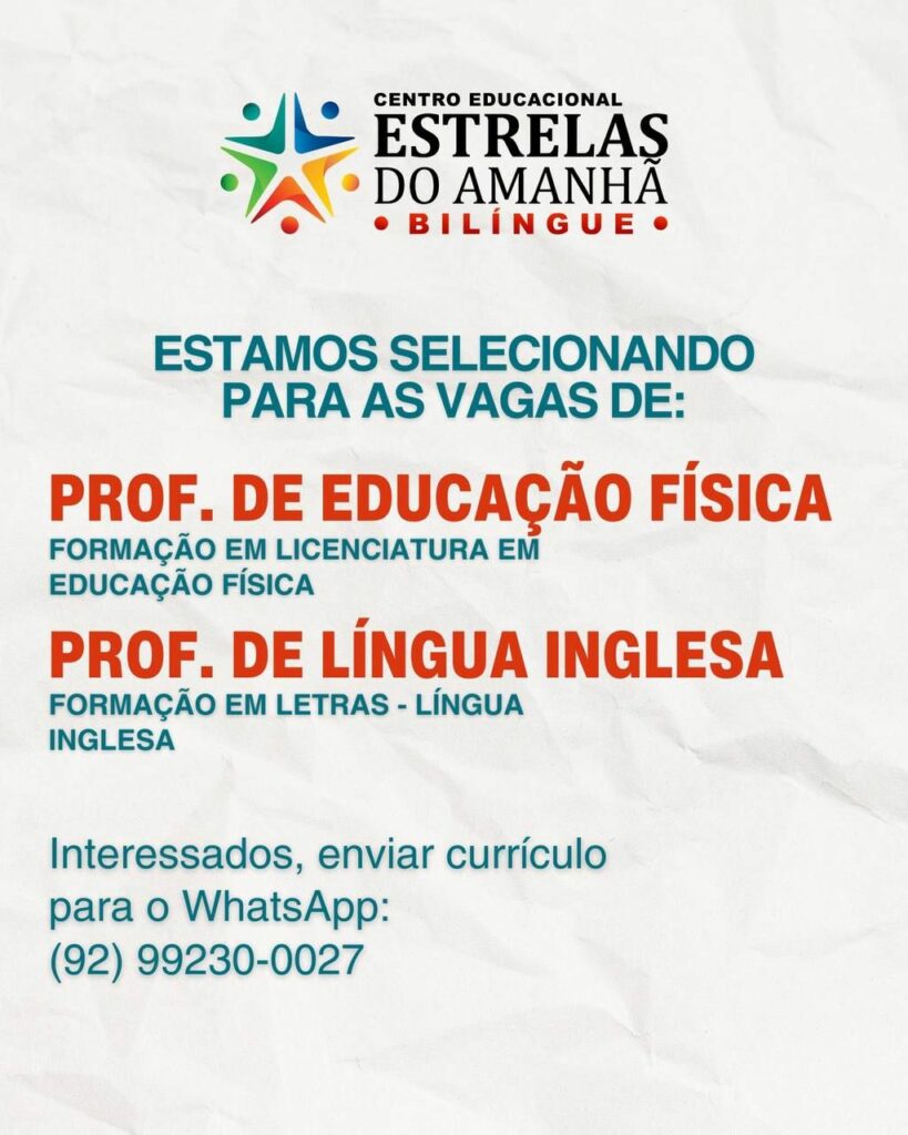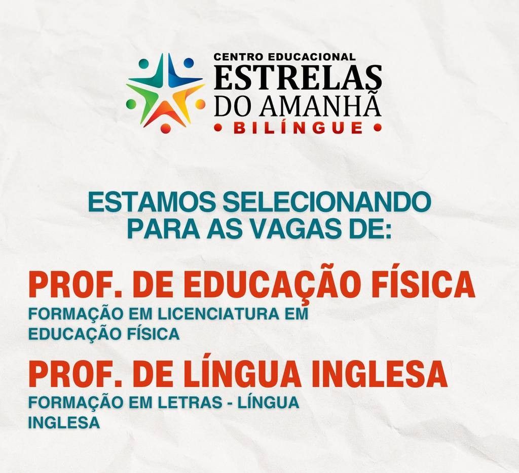 Centro educacional seleciona Professor de educação física, Professor de língua inglesa, Assistente de coordenação, Assistente de rh, Auxiliar de caixa e vendas, Auxiliar de TI ; Envie seu currículo!